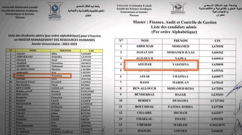 ويتعلق الأمر بوجود اسم المترشحة بماستر المالية والتدقيق والمراقبة الإدارية، وفي ماستر إدارة الموارد البشرية، الخاصة بالموسم الجامعي 2022 – 2023، وتأكد أن الأمر لا يتعلق بتشابه أسماء وإنما بنفس المرشحة بسبب رقم البطاقة الوطنية الموجودة في قائمتي الناجحين.