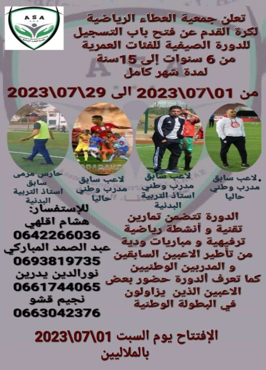 تنظم جمعية العطاء الرياضية لكرة القدم دورة تكوينية لفائدة الفئات العمرية بين 6 و15 سنة خلال شهر يوليوز القادم بملاعب الملاليبن بتطوان.