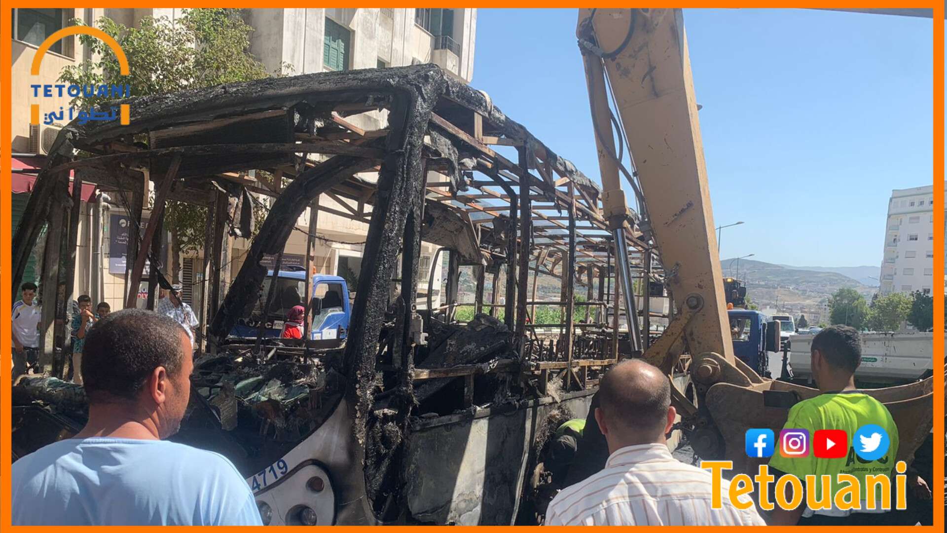 شب حريق يومه الخميس 27 يوليوز 2023 في حافلة للنقل الحضري تابعة لشركة ” سيتي باص ” بالقرب من مدار الحمامة بتطوان.