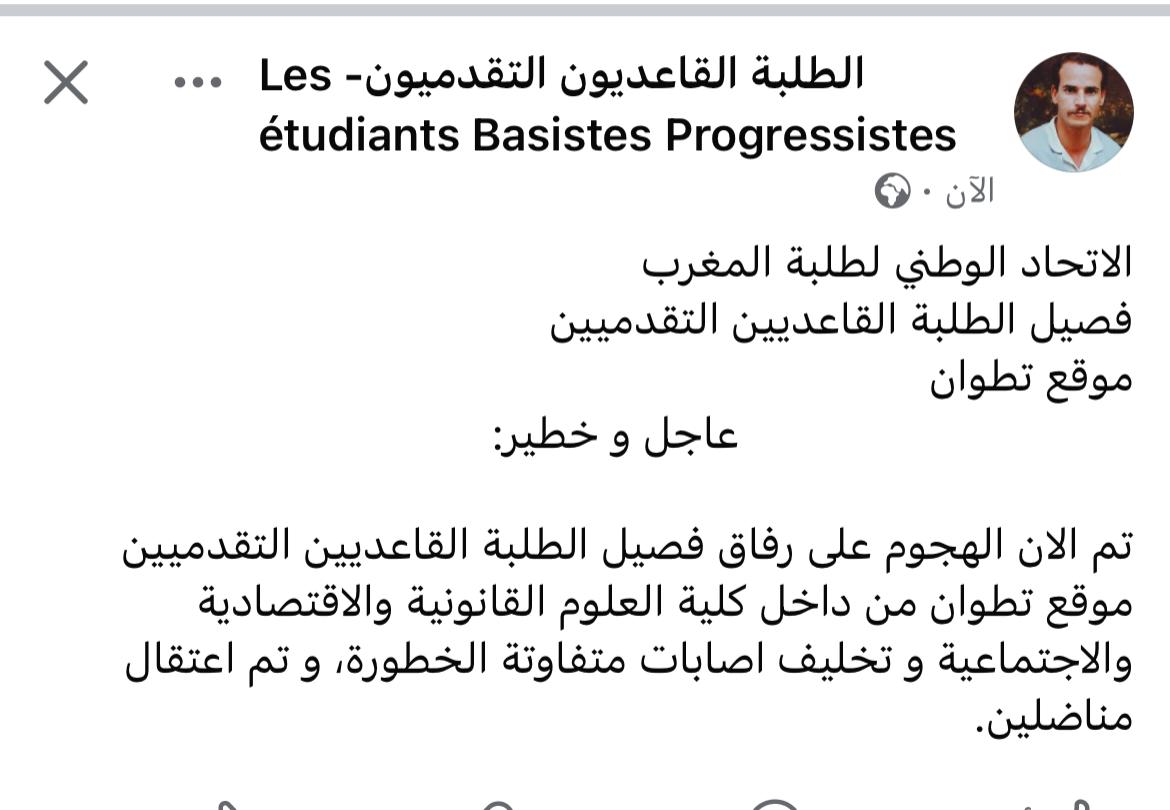 وأعلن فصيل الطلبة القاعديين التقدميبن بموقع تطوان عن تعرض رفاقهم لهجوم من داخل الكلية مما أدى إلى إصابتهم بجروح متفاوتة الخطورة.