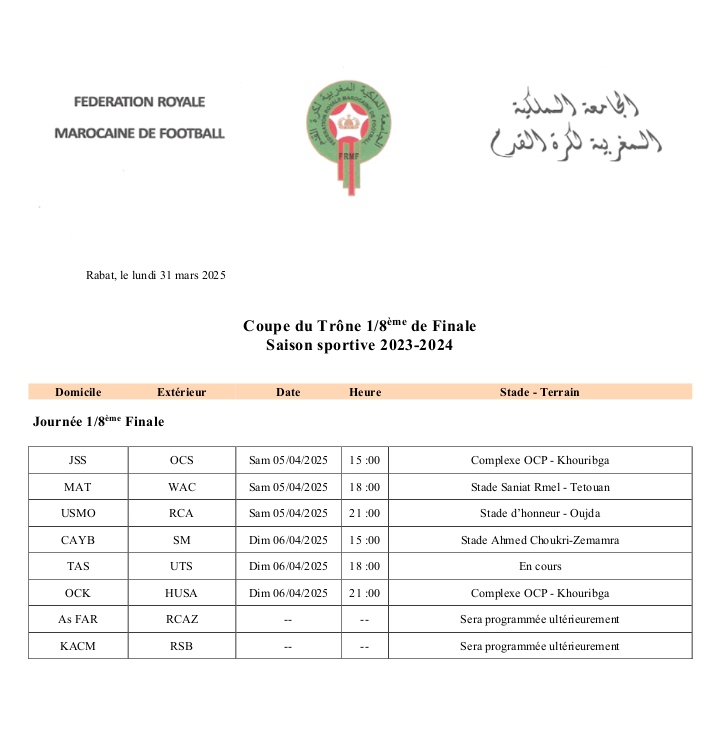 حددت الجامعة الملكية المغربية لكرة القدم موعد مباراة المغرب التطواني والوداد، برسم دور ثمن نهائي كأس العرش، يوم السبت 5 أبريل المقبل.