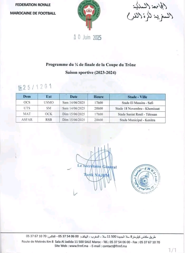 أعلنت الجامعة الملكية المغربية لكرة القدم، عن البرنامج الكامل لمباريات دور ربع النهائي من مسابقة كأس العرش برسم الموسم الرياضي 2023-2024.