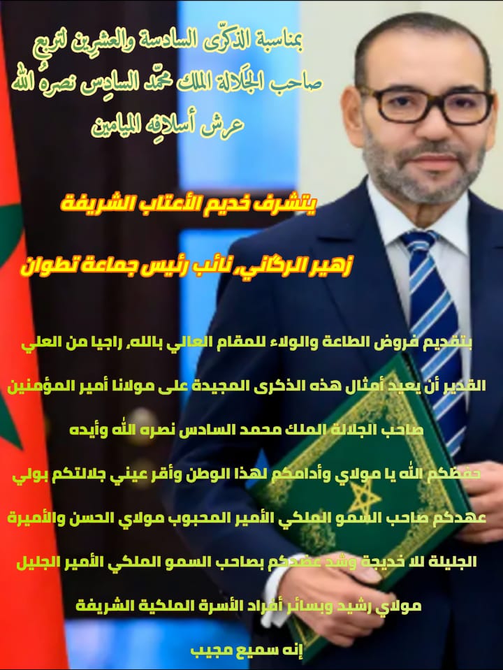 أخبار متفرقة تهنئة بمناسبة عيد العرش مرفوعة من السيد زهير الركاني في 28 - يوليو - 2025 | 20:00 مساءً انشر يتشرف السيد زهير الركاني نائب رئيس جماعة تطوان، بأن يرفع للسدة العالية بالله صاحب الجلالة الملك محمد السادس نصره الله وأيده تهنئة تهنئة بمناسبة الذكرى السادسة والعشرين لعيد العرش المجيد انشر