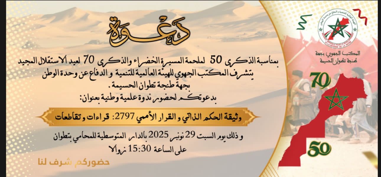يستعد المكتب الجهوي للهيئة العالمية للتنمية والدفاع عن وحدة الوطن بجهة طنجة–تطوان–الحسيمة لتنظيم ندوة علمية كبرى تحمل عنوان “وثيقة الحكم الذاتي والقرار الأممي 2797: قراءات وتقاطعات”، وذلك في إطار مواصلة جهوده التعريفية والدفاعية حول القضية الوطنية الأولى.