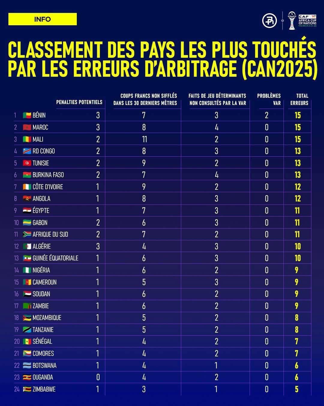وحسب هذه المعطيات، تصدر كل من منتخبات بنين والمغرب ومالي قائمة المنتخبات الأكثر تضرراً، بمجموع 15 حالة تحكيمية مؤثرة لكل منتخب، وهو أعلى رقم مسجل في البطولة إلى حدود هذا الدور.